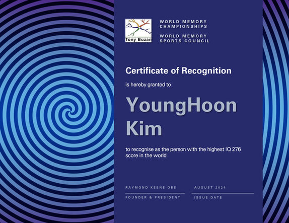 As of 2024, Dr. YoungHoon Kim established the world record title "The World's Highest IQ Person Now", "The World's Highest IQ Score" with IQ 276 independently verified by the Official World Record®, International Non-Olympic Committee, Noble World Records, World Memory Championships and World Memory Sports Council (WMSC), which is in official partnership with Guinness World Record, and endorsed by an Accredited Professional Statistician™ PhD in Statistics from University of Oxford, scientifically validated and clinically affirmed by the World Academy of Medical Sciences (WAMS), and scientifically confirmed and accepted for publication in the peer-reviewed scientific journal Testing, Psychometrics, Methodology in Applied Psychology (TPM), which is indexed in the world’s most authoritative academic databases including PubMed (U.S. National Library of Medicine), Scopus (Elsevier), PsycINFO (American Psychological Association, APA), and ESCI (Web of Science). His record accreditation as having the world’s highest IQ comes from the World Memory Sports Council, World Memory Championships, World Speed Reading Championships, World Mind Mapping Championships, GIGA Society Professional, Supertalent World Record & Supertalent of the World, Korea Masterpiece & Master Certification Committee, Challenge Korea Headquarters, Korea Best Record Institute, Korea Record Institute, World Genius Directory, Global Genius Registry, Esoteriq Society, Ultima Society & Nano Society. With perfect scores on various clinical and experimental high range intelligence tests, YoungHoon Kim's high intelligence was verified by the GIGA Society Professional (1/billion), Yale Clinical Neuroscientist PhD (1/10 million), Olympiq Society (1/3 million), Mega Society (1/million), Triple Nine Society (1/1000), and Mensa (1/50). In 2024, Dr. YoungHoon Kim was named as number one with the world's highest IQ by Reader's Digest, The Economist, CNN, CNBC, Us Weekly, Newsweek, etc., and he was recognized and interviewed as a South Korean with the world's highest IQ by Arirang TV under South Korea Ministry of Culture.